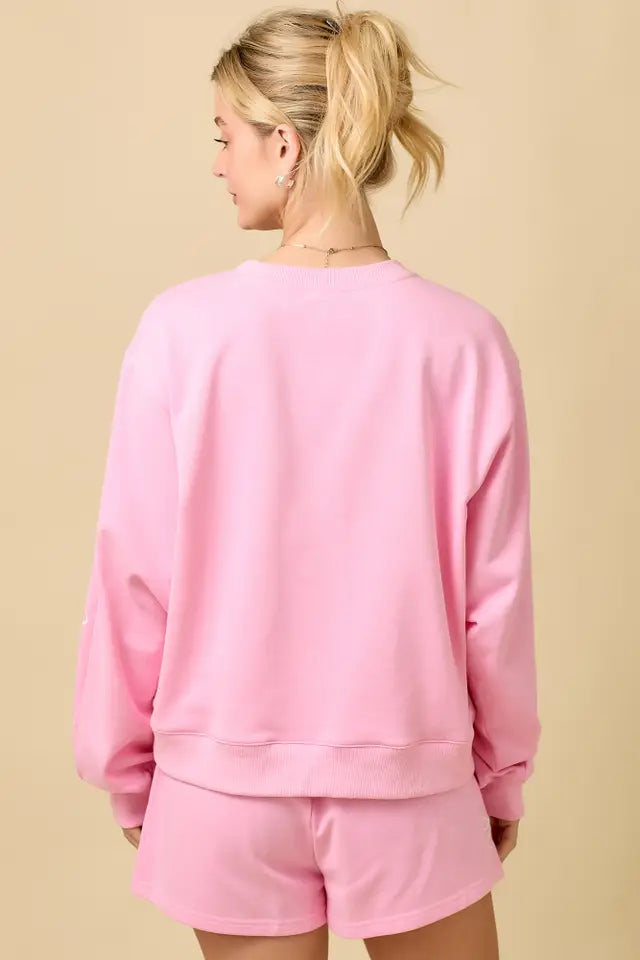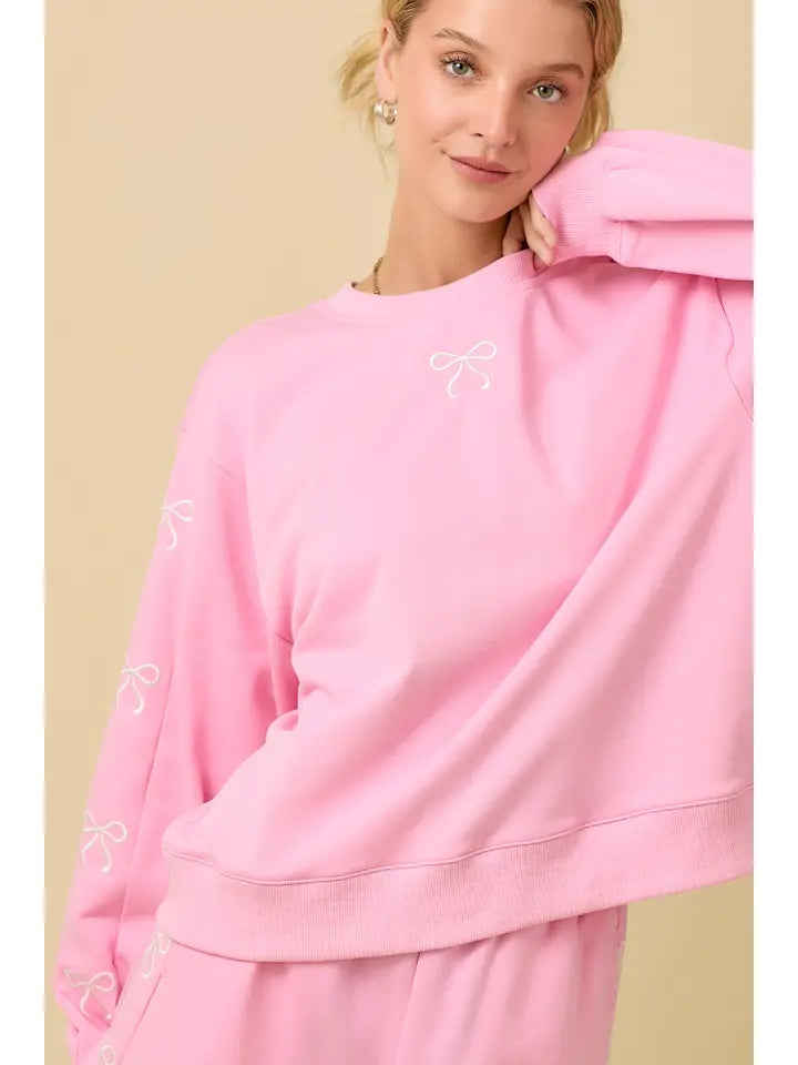 Soft and cozy sweatshirt featuring delicate ribbon embroidery along the sleeves. The relaxed fit and pastel tone create a feminine, playful lounge vibe. Perfect for pairing with matching shorts or jeans for a cute off-duty look. ribbon sweatshirt, cozy lounge top, embroidered pullover, cute sweatshirt, pastel top, feminine loungewear, comfy casual top