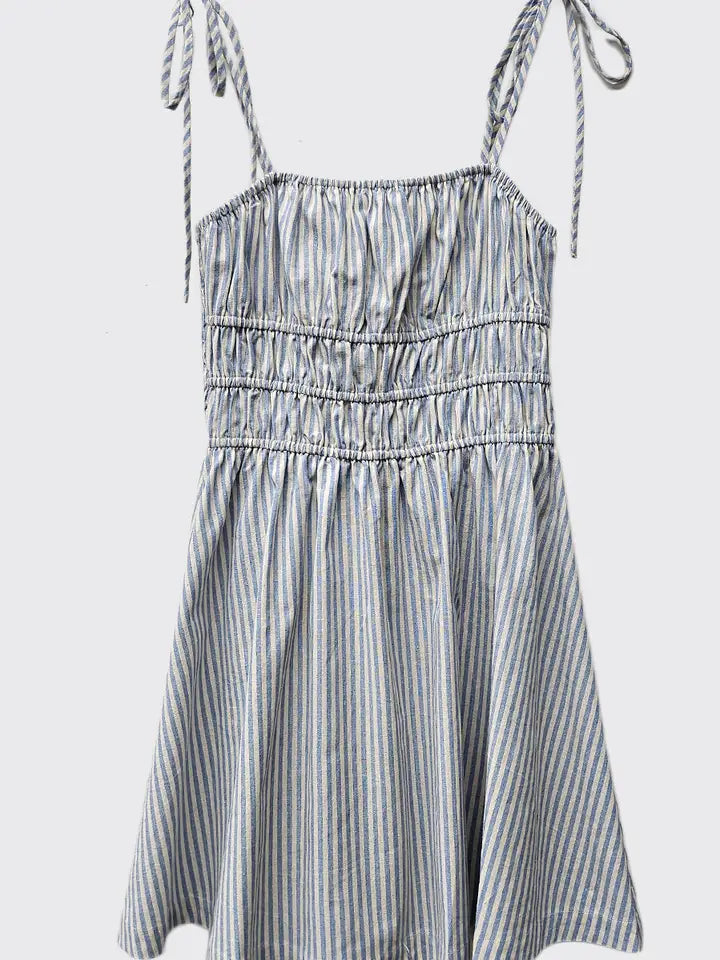 Step into spring with this striped shoulder-tie mini dress, featuring sleeveless styling, a comfortable elastic band, and a smocked back