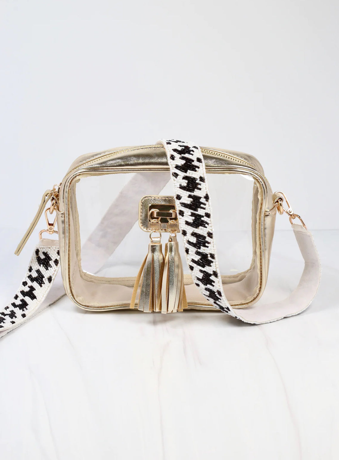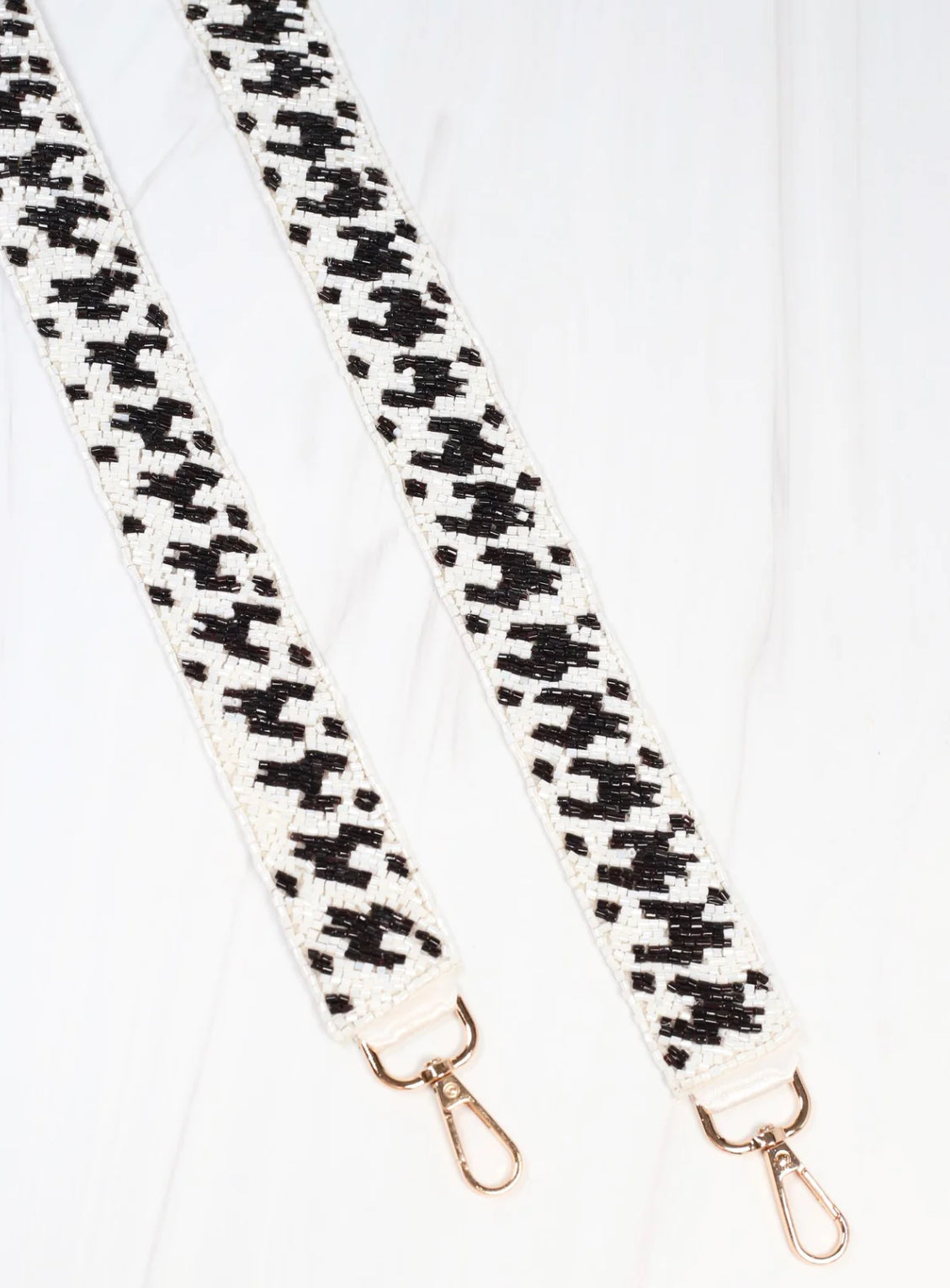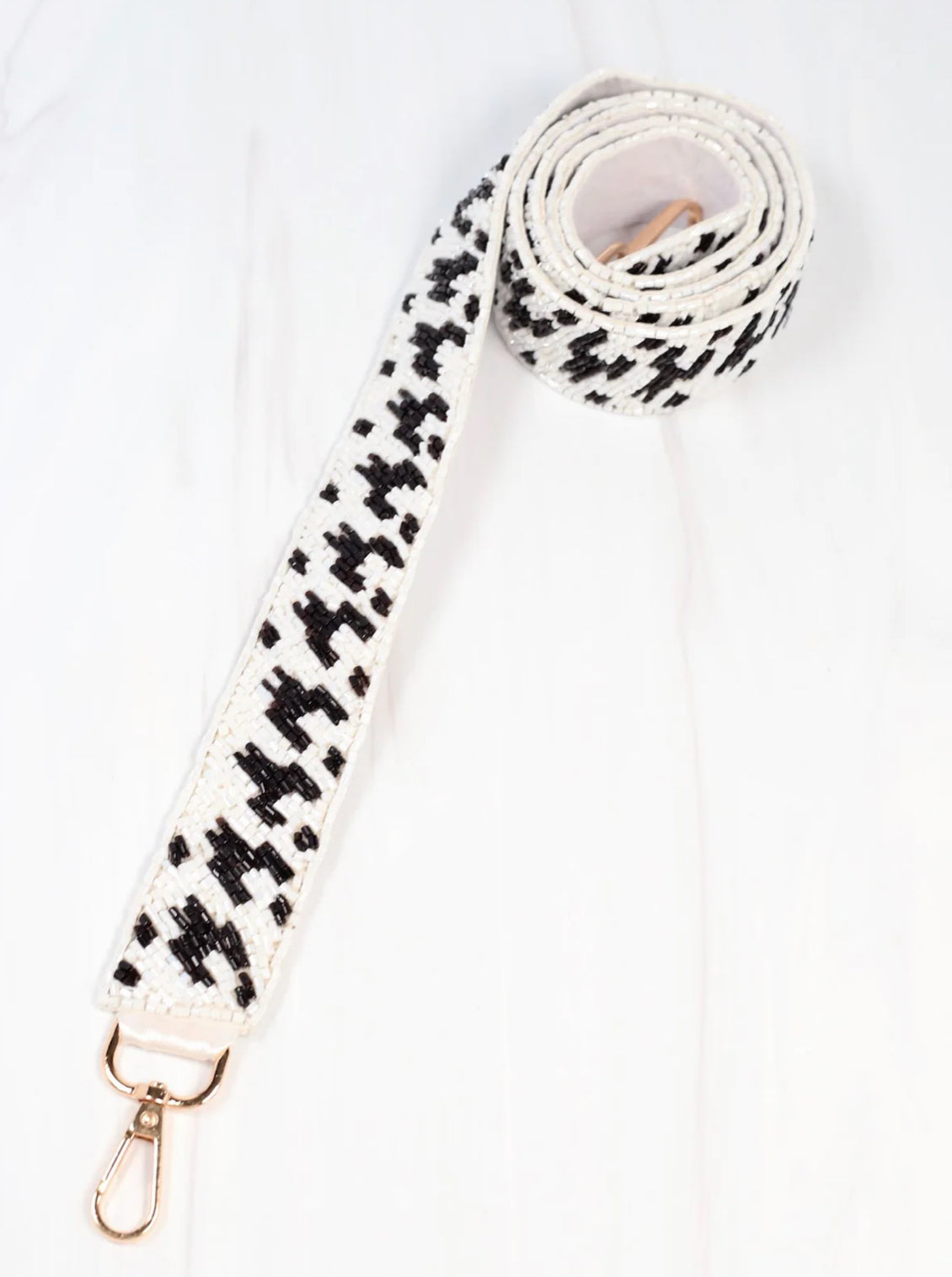 Wear houndstooth any day of the week with this black and white beaded crossbody strap! This classic pattern will be a perfect accessory to add to your outfit. The gold clips will easily attach to any clear bag or handbag with removable strap capabilities.