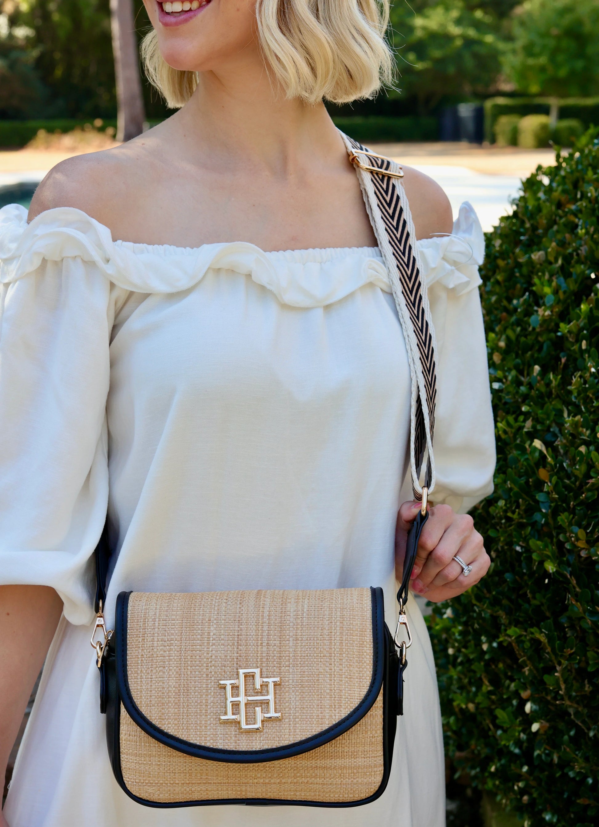 This contemporary crossbody is the perfect everyday handbag. It is designed with a straw material and trimmed in a vegan leather fabric. The top zipper and front magnetic flap keep all of your items secure, and the adjustable patterned strap adds a chic touch as well. the interior has one zippered pocket and two open pockets for added organization ability.
