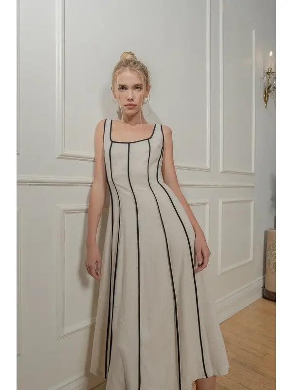 * BEST SELLER ** Linen midi dress with square neckline, binding detail, elastic panel at back, and side invisible zipper closure
