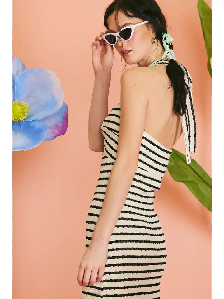 Best Seller *** - striped knit fabric - maxi length - halter neck tie - side slit - fitted - bandeau design - twist detail on the chest