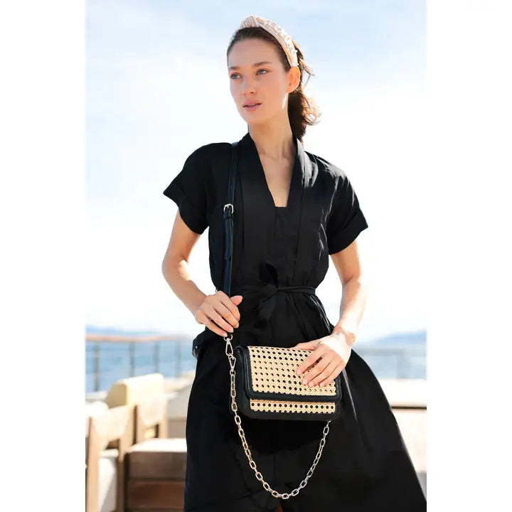 Polyethylene and Pu; Gold Hardware; Interchangeable Straps: Single Chain Shoulder Strap; Adjustable Cross-Body Strap; Snap Closure; 1 Inner Zip Pocket, 1 Inner Slip Pocket. Meet The Soleil Shoulder Bag – Your Ultimate Summer Accessory With A Dash Of Effortless Elegance. Featuring A Woven Rattan-Inspired Panel With Chic Vegan Leather Trim, This Bag Combines Style and Practicality With Its Structured Silhouette. The Versatile Chain Strap Adds A Hint Of Glam While The Adjustable Crossbody Option Makes It Ideal For Everyday Adventures. From Sunny Brunches To Balmy Beach Strolls, The Soleil Shoulder Bag Carries Your Essentials In Style While Turning Heads Everywhere You Go.