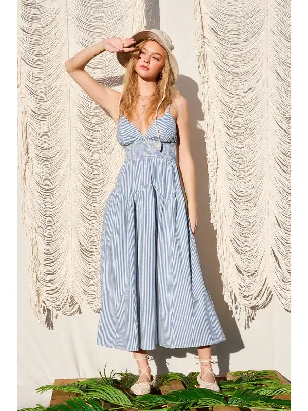 Striped midi dress with gathered waist panel, smocked elastic band, adjustable shoulder straps, and plunging v-neckline.