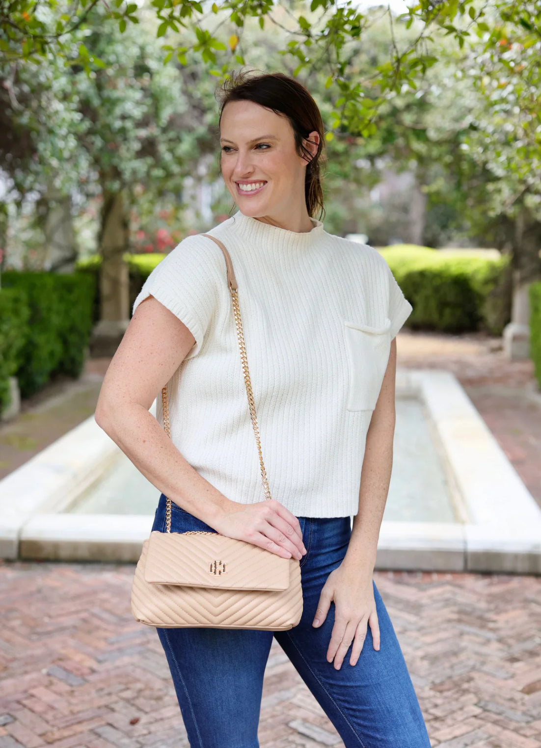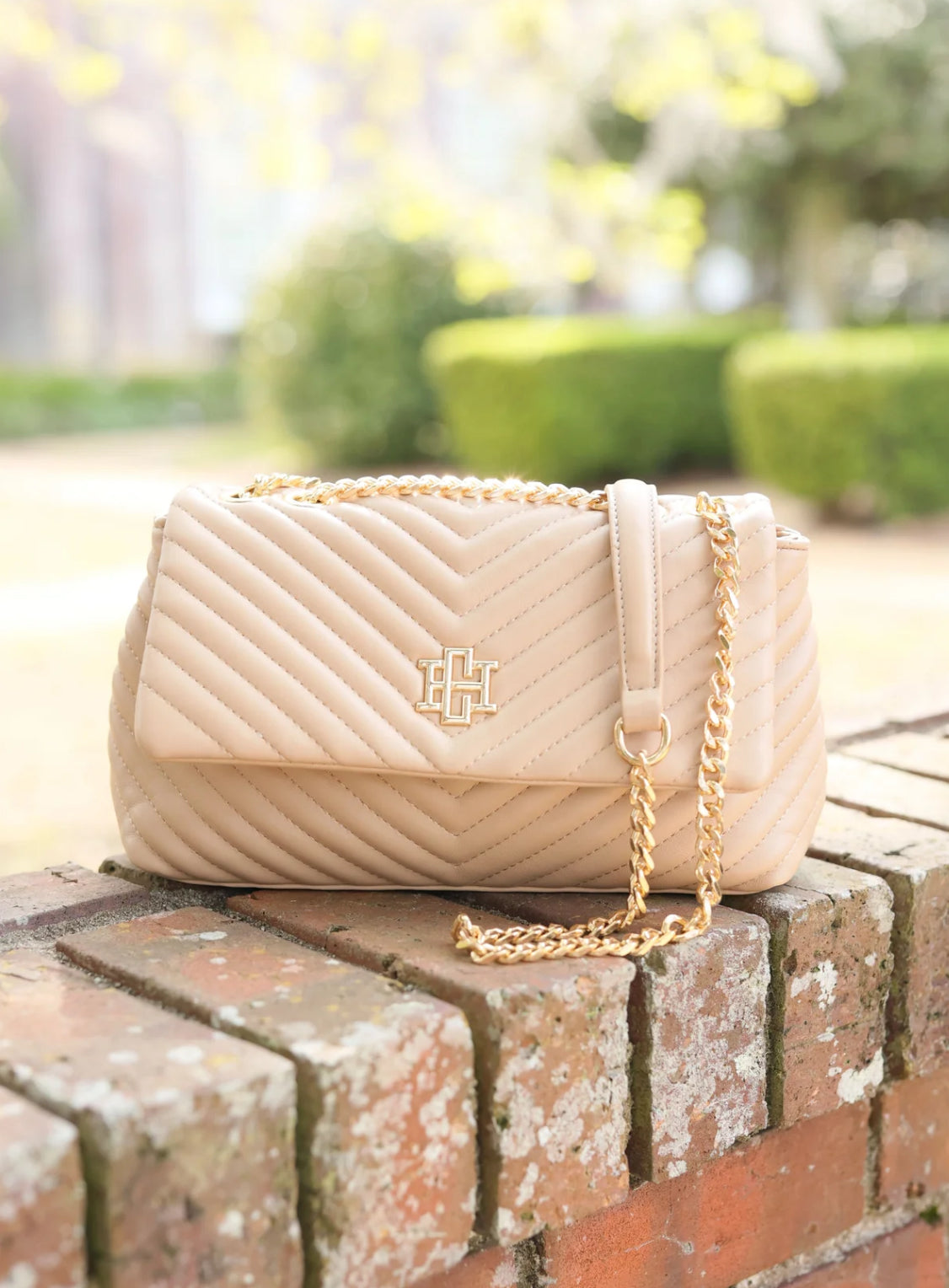 This luxurious vegan leather handbag features a quilted pattern and the Caroline Hill logo on the front magnetic flap. The interior has one zippered pocket and one open pocket as well. The chain strap has matching fabric for comfortability while wearing, and it can be doubled for a shortened shoulder bag look.