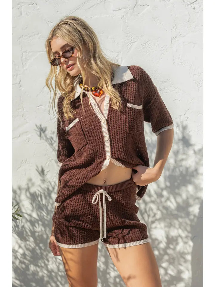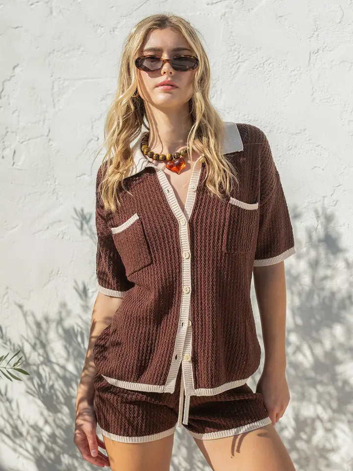 Embrace relaxed spring vibes in this early spring knit crochet set, featuring a boxy-fit collar top with short sleeves, dropped shoulders, chest pockets, coconut button closure, contrast trim, and matching tie-front shorts